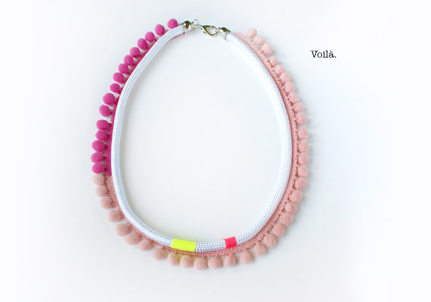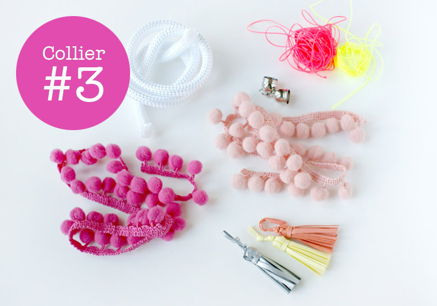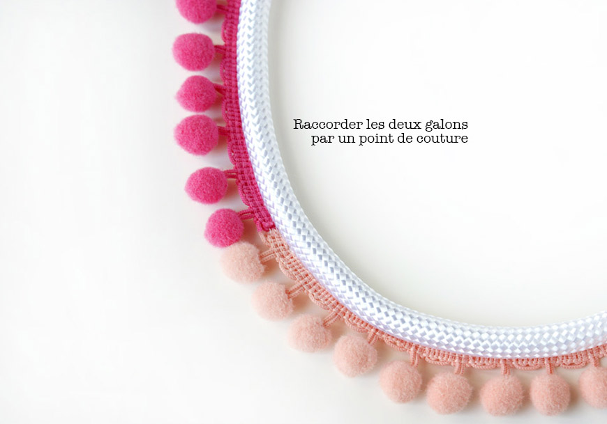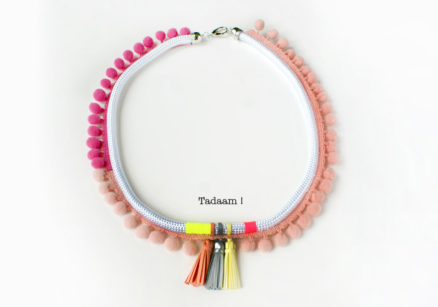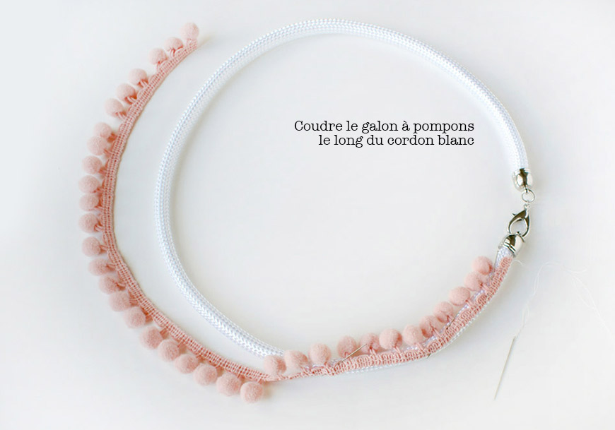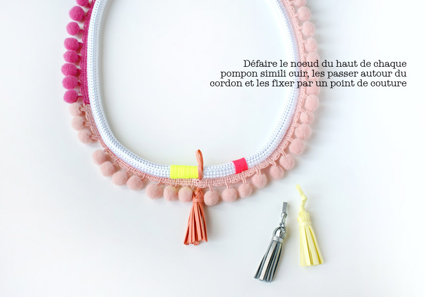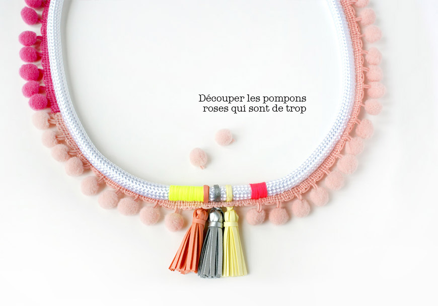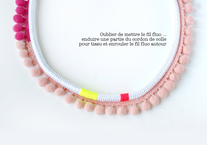 Regardez le diaporama entier avant de vous lancer dans le montage du collier … j’ai cafouillé dans l’ordre des étapes, comme en couture (je suis une pro pour ça) ! C’est d’abord fil fluo, ensuite galon à pompons. 😀